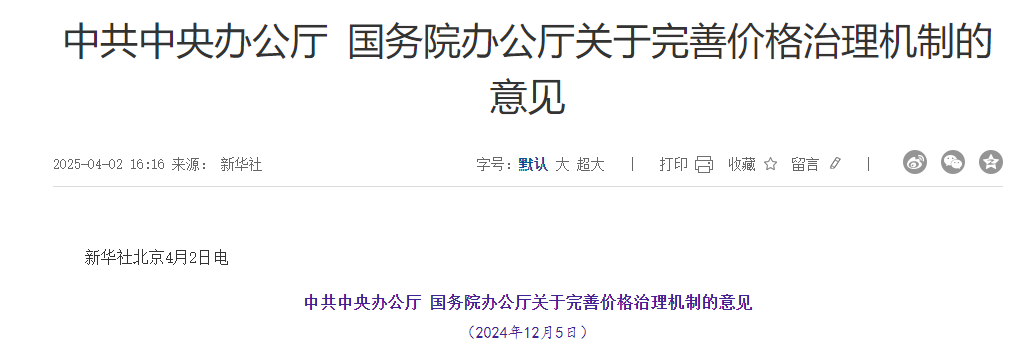 發表時間:2025-04-02 14:57 瀏覽次數:1042 〖返回〗近日,中共中央辦公廳、國務院辦公廳發布《關于完善價格治理機制的意見》。文件要求,圍繞充分發揮市場在資源配置中的決定性作用、更好發揮政府作用,健全市場價格形成機制,創新價格引導機制,完善價格調控機制,優化市場價格監管機制,提高資源配置效率。