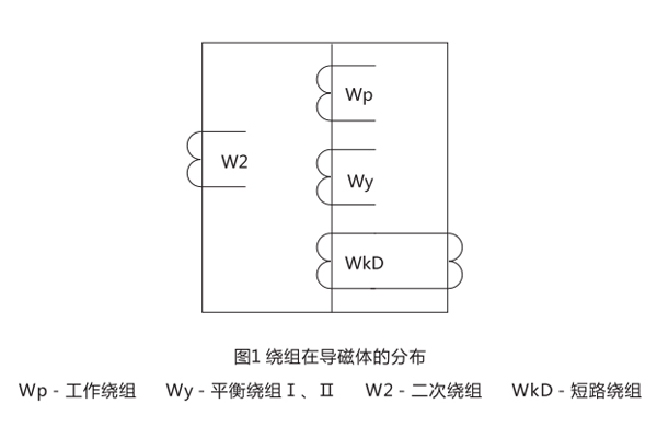 變流器的導(dǎo)磁體是一個(gè)三柱形鐵芯,用幾組“山”形導(dǎo)磁片疊裝而成,在導(dǎo)磁體的中柱上放置工作繞組和平衡繞組制動(dòng)繞組和次級(jí)繞組則均分成兩部分,分別放在導(dǎo)磁體的兩個(gè)邊柱上,其連接方法應(yīng)使得制動(dòng)繞組與二次繞組及平衡繞組I、Ⅱ之間亦無(wú)相互感應(yīng),二次繞組里的感應(yīng)電勢(shì)是由工作繞組的磁化產(chǎn)生的,為了能改變變流器導(dǎo)磁體被飽和的程度,制動(dòng)繞組的匝數(shù)做成是可以改變的。