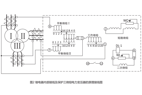 變流器的導磁體由“E”形導磁片疊裝而成,有平衡繞組和短路繞組。此外,中間柱上的短路繞組與右側邊柱上的短路繞組通過一瓷盤電位器相連接,二次繞組放在導磁體的另一側邊柱上。繞組在導磁體的分布如圖1所示。繼電器的內部接線及其保護三繞組電力變壓器的原理接線圖如圖2所示。由于具有平衡繞組,且每隔一匝有抽頭,便于調整用以消除由于電流互感器變比不一致等原因引起的不平衡電流的效應。具有兩個平衡繞組就使得繼電器能用于保護三繞組的電力變壓器。