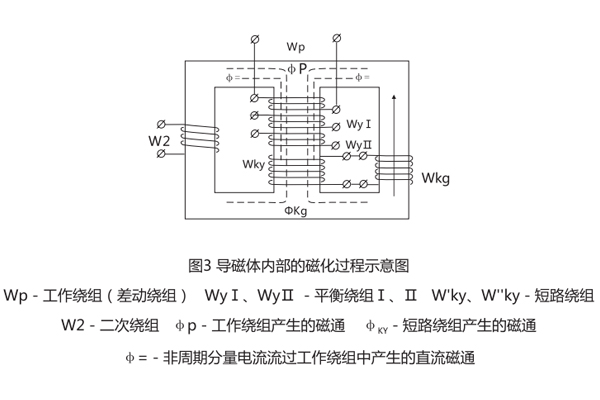 具有短路繞組的變流器,其特點(diǎn)是專門利用非周期性電流來磁化導(dǎo)磁體,圖3表示了導(dǎo)磁體內(nèi)部的電磁過程,當(dāng)電力變壓器空載合閘時(shí), 瞬時(shí)值很大的勵(lì)磁涌流全部流過工作繞組,涌流波形具有偏于時(shí)間軸的磁通。它們在短路線組里產(chǎn)生兩種不同的反應(yīng),直流磁通的作用下,導(dǎo)磁體迅速飽和,大大降低了導(dǎo)磁率,這就大大惡化了工作繞組與二次繞組間的電磁感應(yīng)條件,因而顯著增大了繼電器的動(dòng)作電流,這就是所謂直流偏磁作用。