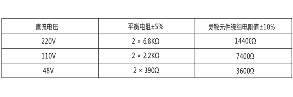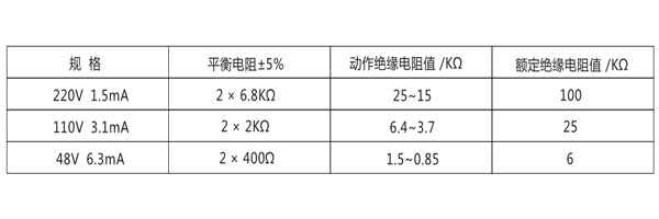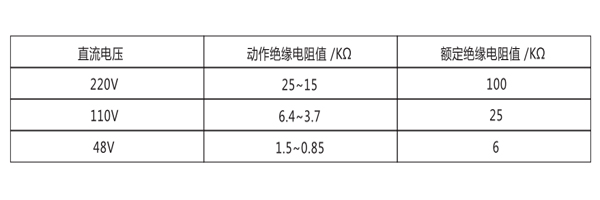 繼電器動作值:當(dāng)母線任何一側(cè)對地絕緣電阻下降到下表值時,繼電器應(yīng)靠動作。