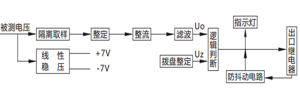 被測電壓經過隔離取樣后,得到與被測電壓成比例的取樣電壓Ui、Ui經撥盤整定,再進行整流濾波,得到直流Uo,邏輯回路將Uo 與門坎電壓Uz進行比較。若Uo<Uz,則出口繼電器不動作;若Uo>Uz,則出口繼電器動作。欠電壓在欠電壓狀態下動作指示燈發光 過電壓在過電壓狀態下動作指示燈發光。
