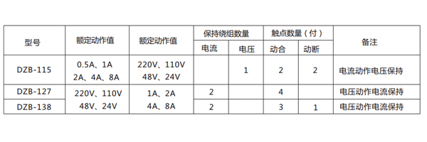 DZB-115帶保持中間繼電器的參數(shù)見下表