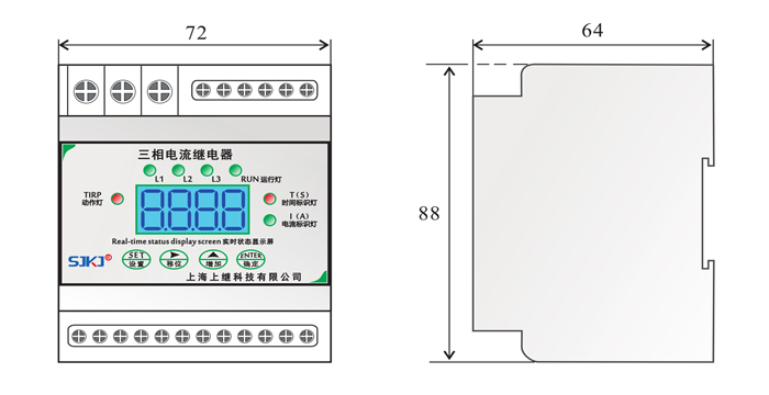 , 無數(shù)值顯示。繼電器達(dá)到所設(shè)定值,動作后,由TIRP動作燈會點(diǎn)亮,實(shí)際線路電流低于或高于所設(shè)定的返回值,指示燈切換回來。正常運(yùn)行情況下,RUN運(yùn)行燈、電流設(shè)置表示燈常亮。L1、L2、L3來回切換運(yùn)行。當(dāng)輸入電流任意一相滿足動作條件,繼電器動作,電流標(biāo)識燈熄滅,表示延時時間已到動作。當(dāng)輸入接近動作條件時,繼電器進(jìn)入動作預(yù)備狀態(tài),所有芯片資源用來計算輸入值,一旦滿足條件,立即啟動計時,繼電器設(shè)有啟動量連續(xù)判斷功能和突變量連續(xù)判斷功能,能夠有效迅速的判斷輸入值,并躲過短時干擾。
