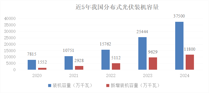 截至2024年末,全國光伏發電裝機容量達8.86億千瓦,同比增長45%,排在火電之后,位居第2位,其中集中式光伏5.11億千瓦,分布式光伏3.75億千瓦。全年光伏新增裝機2.78億千瓦,同比增長28%,其中集中式光伏1.59億千瓦,分布式光伏1.18億千瓦。全年光伏發電量達到8341億千瓦時,同比增長44%,但仍落后于核電的發電量,排在第5位。全年發電利用小時數為1211小時,發電上網利用率96.8%,較上年有所降低。